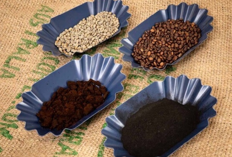 (왼쪽 위로부터)볶지 않은 커피 원두와 볶은 커피 원두, 원두 찌꺼기 및 연구팀의 커피 바이오 숯 샘플