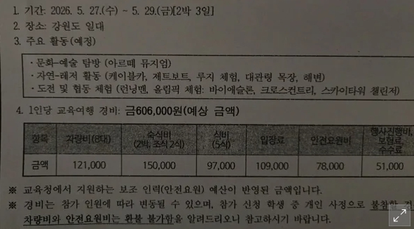 지난 7일 한 온라인 커뮤니티에는 '수학여행 경비 보더니 안 가겠다는 아들'이라는 제목의 글이 올라왔다는데, 학부모 A씨에 따르면 중학교 3학년 자녀가 수학여행 비용이 지나치게 비싸다며 가지 않겠다고 했고, 친구들 사이에서도 불참하겠다는 의견이 적지 않다고 한다. 이어 "처음에는 그래도 가는 게 좋지 않을까 싶었지만 비용을 보니 다소 과하다는 생각이 들었다"며 "평일에 강릉으로 가는 일정인데 숙박비와 식비, 40인승 버스 비용까지 저 비용이 맞나 싶다"며 의문을 제기했다고. 함께 첨부된 안내문에 따르면 수학여행은 다음 달 27일부터 29일까지 2박 3일 일정으로, 강릉을 포함한 강원도 일대에서 진행되고, 일정은 예술 탐장, 레저 활동, 도전 및 협동 체험 프로그램 등으로 구성돼 있다고. 1인당 예상 경비는 60만 6000원으로 책정됐다는데, 세부 항목은 △차량비 12만 1000원 △숙박 및 조식(2박) 15만 원 △식비(5식) 9만 7000원 △입장료 10만 9000원 △안전요원비 7만 8000원 △행사진행비·보험료·수수료 5만 1000원 등이란다. 학교 측은 "경비는 참가 인원에 따라 변동될 수 있으며 참가 신청 학생 중 개인 사정으로 불참할 경우 차량비와 안전요원비는 환불 불가하다"라고 안내했다고. 사연을 접한 네티즌들은 엇갈린 반응을 보였다는데, 우선 옹호하는 네티즌들은 "저렴한 건 아닌데 각 항목 보면 무리한 가격도 아닌 것 같다", "체험 활동들이 다 비쌀 만하다"라는 의견이라고. 반면 반대하는 네티즌들은 "교육청 지원까지 받았는데 가격이?", "안전요원을 학생 1명당 1명씩 붙여주나", "식사가 매번 호텔급으로 나오는 건가" 등의 반응을 보였다고.