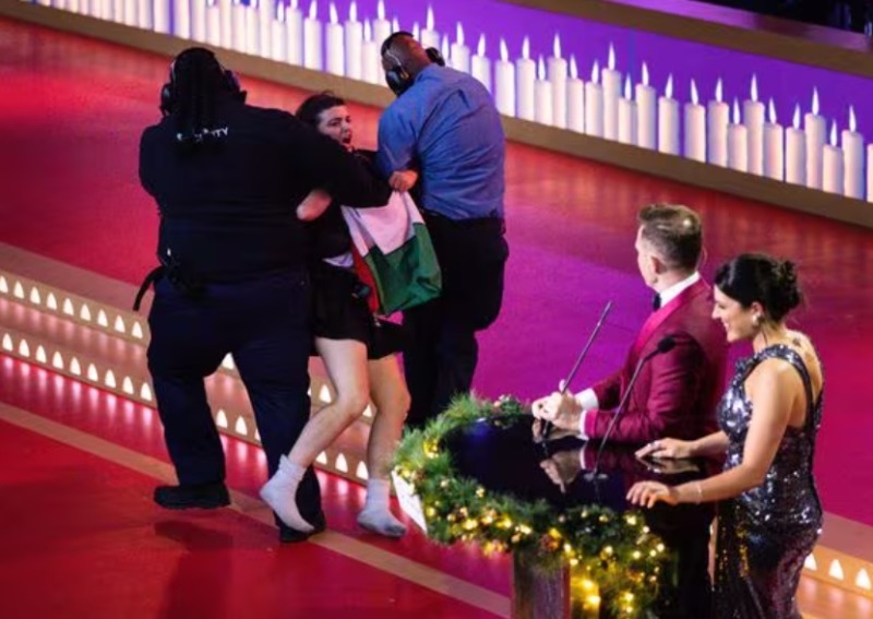 멜버른 ‘캐럴 바이 캔들 라이트’ 행사장 무대에 난입한 팔레스타인 시위자