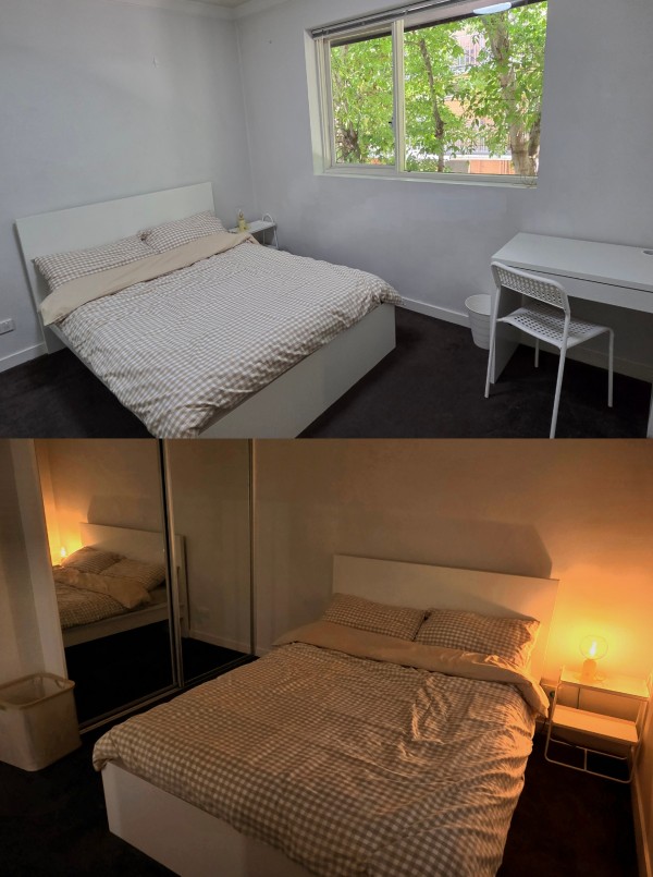 더블 침대, 사이드 테이블, 조명 구비