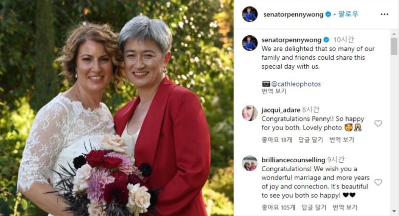 호주 첫 아시아계이자 성소수자 외교장관인 페니 웡(55)이 애들레이드의 한 와이너리에서 약 20년간 연인이던 소피 알루아시 동성 연인과 결혼했다고 AAP 통신 등이 17일 보도했다. 결혼식에는 앤서니 앨버니지 호주 총리와 여러 각료가 참석했으며 두 사람이 체외수정(IVF)을 통해 얻은 두 딸 알렉산드라(11)와 한나(8)가 들러리를 선 것으로 알려졌다. 말레이시아 코타키나발루에서 태어나 5살 때 호주로 이주한 웡 장관은 변호사로 일하다 2002년 사우스오스트레일리아주 상원의원으로 당선되면서 정치 활동을 시작했다. 아시아계이자 여성이면서 성소수자인 그녀는 백호주의 정서가 뿌리 깊은 호주에서 정치인으로 두각을 나타내고 있다. 2007년 기후변화장관으로 발탁되면서 호주 최초의 아시아계 장관이 됐고, 2010∼2013년까지 재무장관을 역임했다. 또 2022년 노동당이 다시 집권하면서 호주 최초의 아시아계 외교장관을 맡고 있으며, 최근 호주 내 최장수 여성 내각 장관이 되기도 했다. 2009년에는 '세계에서 가장 아름다운 여성 정치인 50인' 가운데 한 명으로 뽑혔으며, 최근 각종 여론조사에서 호주 내 가장 신뢰할 수 있는 정치인으로 뽑히면서 차기 호주 총리 후보로도 거론된다. 웡 장관은 자신의 인스타그램에 웨딩드레스를 입은 알루아시와 함께 찍은 사진을 올리며 "많은 가족과 각료들, 친구들이 특별한 날을 함께 해 기쁘다"고 적었다. 울나라에서는 절대 일어날 수 없는 일인데,,,,,호주가 확실히 달라!!!!