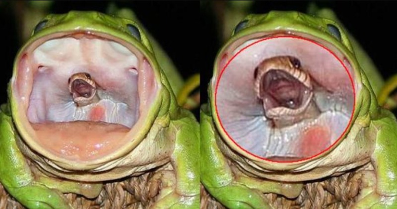 호주 나무청개구리가 뱀을 삼키기 직전의 모습