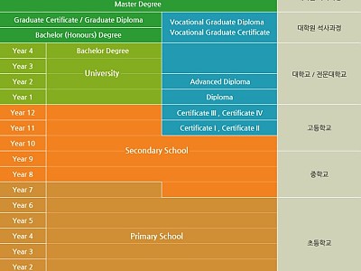 일반적으로 초등학교Year1 - Year6(6년),중학교 Year7 - Year10(4년), 고등학교 Year11 - Year12(2년), 그리고 대학교는 대체로 3년으로 되어 있…
